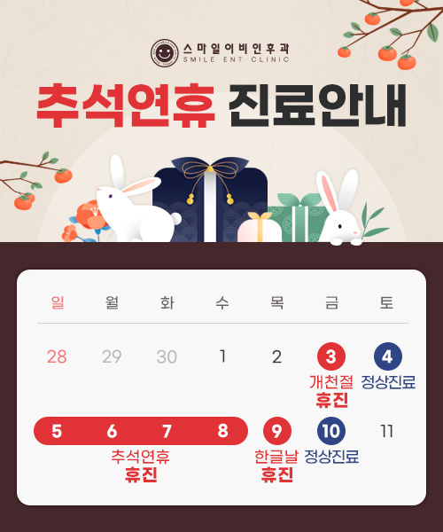 안녕하세요. 스마일이비인후과입니다. 추석연휴 진료일정을 안내해 드립니다.