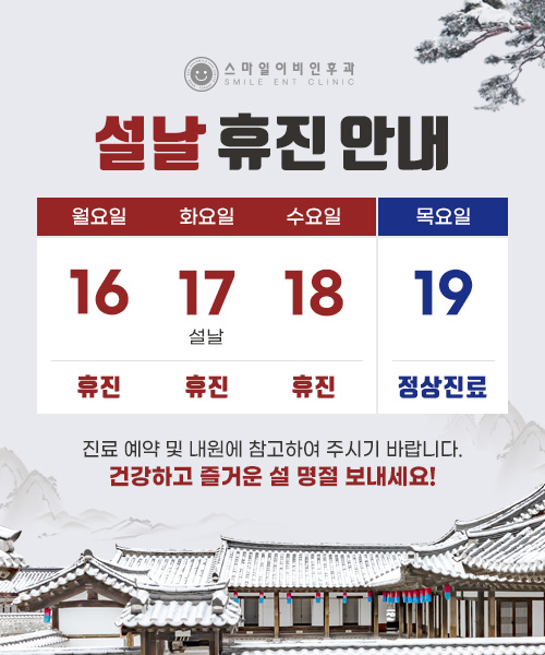 안녕하세요. 스마일이비인후과입니다. 민족의 대명절 설을 맞아 휴진 일정을 안내드립니다.