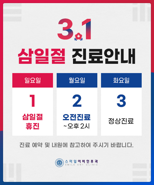 3월 2일 (월요일) 대체공휴일은 오전 진료로, 오후 2시까지 진료합니다.